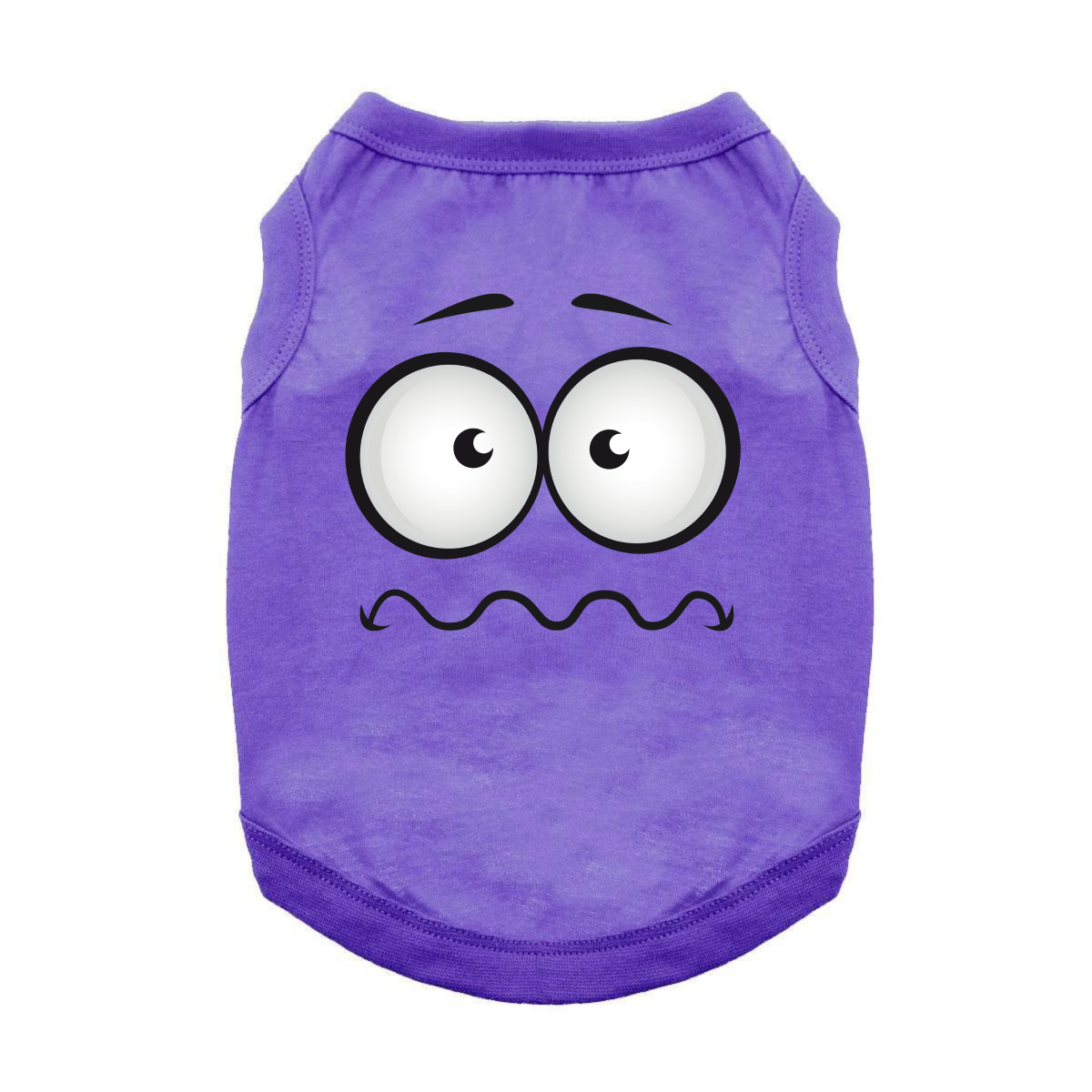 Sometimes anxiety gets the better of you.  Add a touch of awkward charm with the Nervous Face Dog Shirt in vibrant Ultra Violet. The expressive, uneasy face set on deep violet 100% cotton makes for unique pet photos, themed events, a fun conversation starter or showing this pup can get nervous and anxious. The pullover style, high-cut design, and lightweight material ensure comfort and flair!