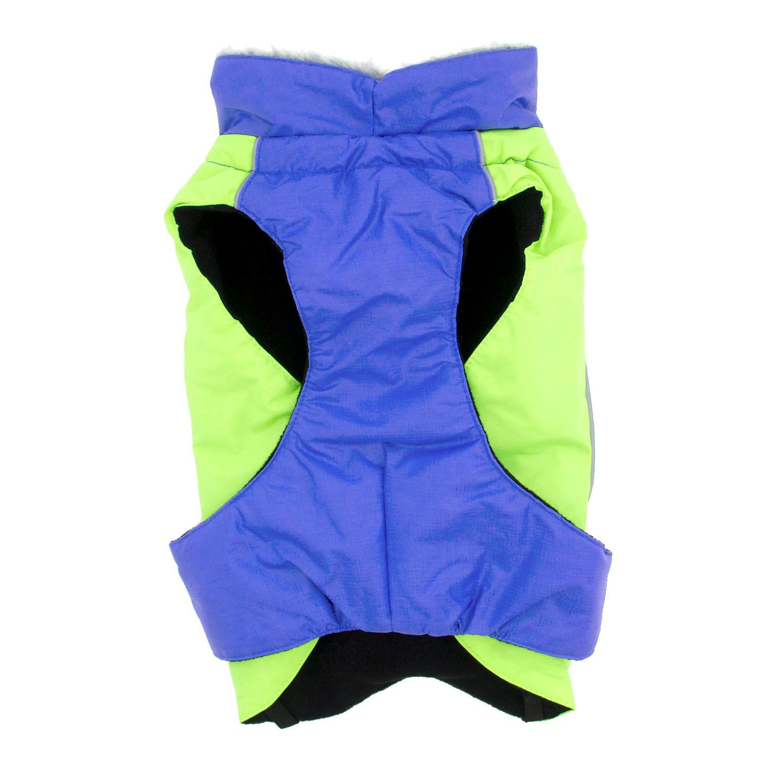They come with adjustable straps, covered d-ring access hole, fur lined collar with neck cinch, and reflective night safety straps and trim.